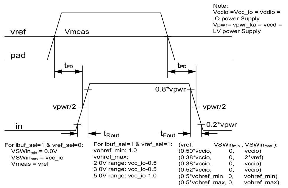 hld_h_n=0must go to 0 before vccd is taken to 0. During the hold mode of operation and with vccd=0 (or floating), the input buffer can actively drive out depending on pad input if there is a valid I/O (vddio, vddioq and vcchib) power supply. This functionality is implemented in the behavioral model. If vccd=0 (or floats) and when the I/O is not in the hold mode of operation, the behavioral model would force anXon the outputs of the input buffer (outandout_h) and the input buffer cannot be actively driven from pad.In hibernate mode, the I/P buffer just needs to toggle. It need not meet the VIH/VIL specs.